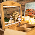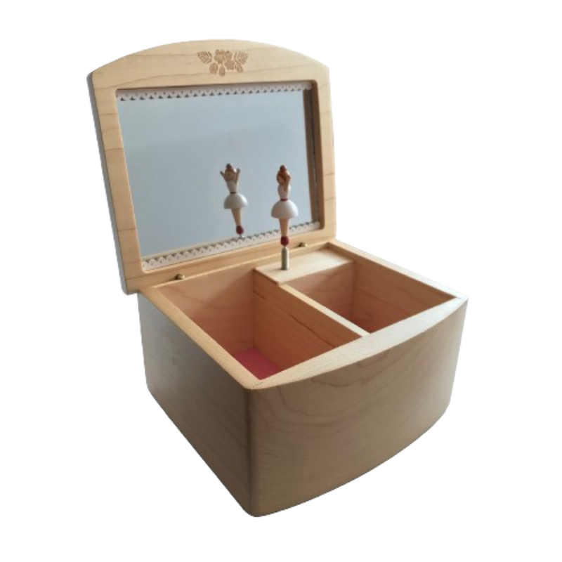En esta versión, Wooderful life emula esta imagen clásica y la reinterpreta en un diseño de madera (maple natural) más minimalista que en su cubierta tiene una tierna abejita🐝 que ronda unas flores de madera con frutillita 🍓 y al abrirla, te sorprende esa bailarina clásica de tus sueños que se refleja en la claridad de un espejo, girando al son de una melodía clásica, desde donde cuida los tesoritos que puedes guardar en sus dos compartimentos, forrados en un delicado tapiz color rosado.